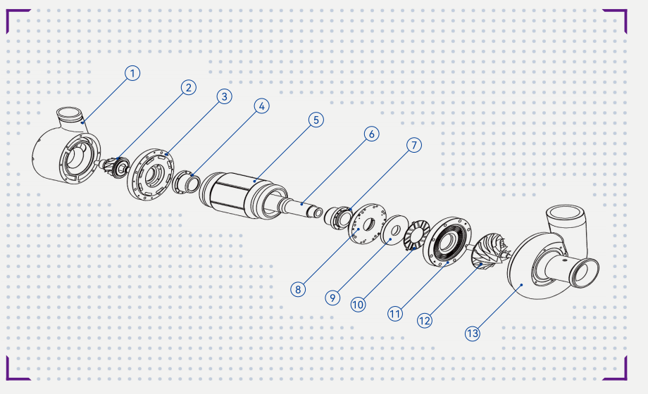 The turbo air end is composed of a permanent magnet synchronous motor, a three-dimensional flow impeller, a volute,a dynamic pressure air bearing, and a cooling impeller.The motor is directly connected to the impeller, and there is no transmission loss.